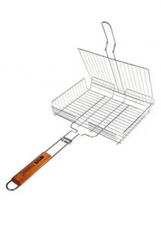 рукоятка оснащена деревянной вставкой и фиксирующей скобой, которая зажимает створки решётки.