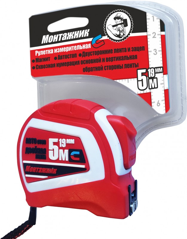 Рулетка с автостопом и магнитом 5мх19мм Монтажник
