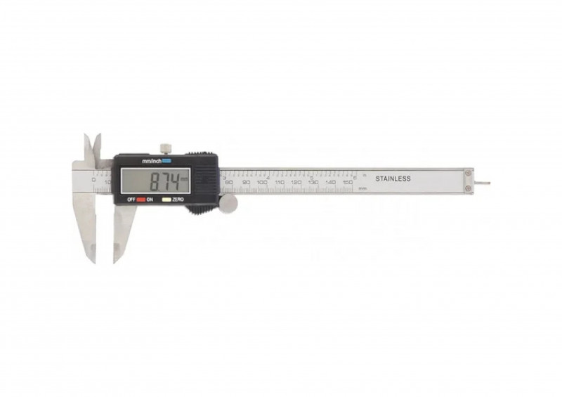 Штангенциркуль представляет собой удобный инструмент с цифровым дисплеем. Имеется возможность переключения режима отображения между миллиметрами и дюймами. Конструкция включает в себя глубиномер.